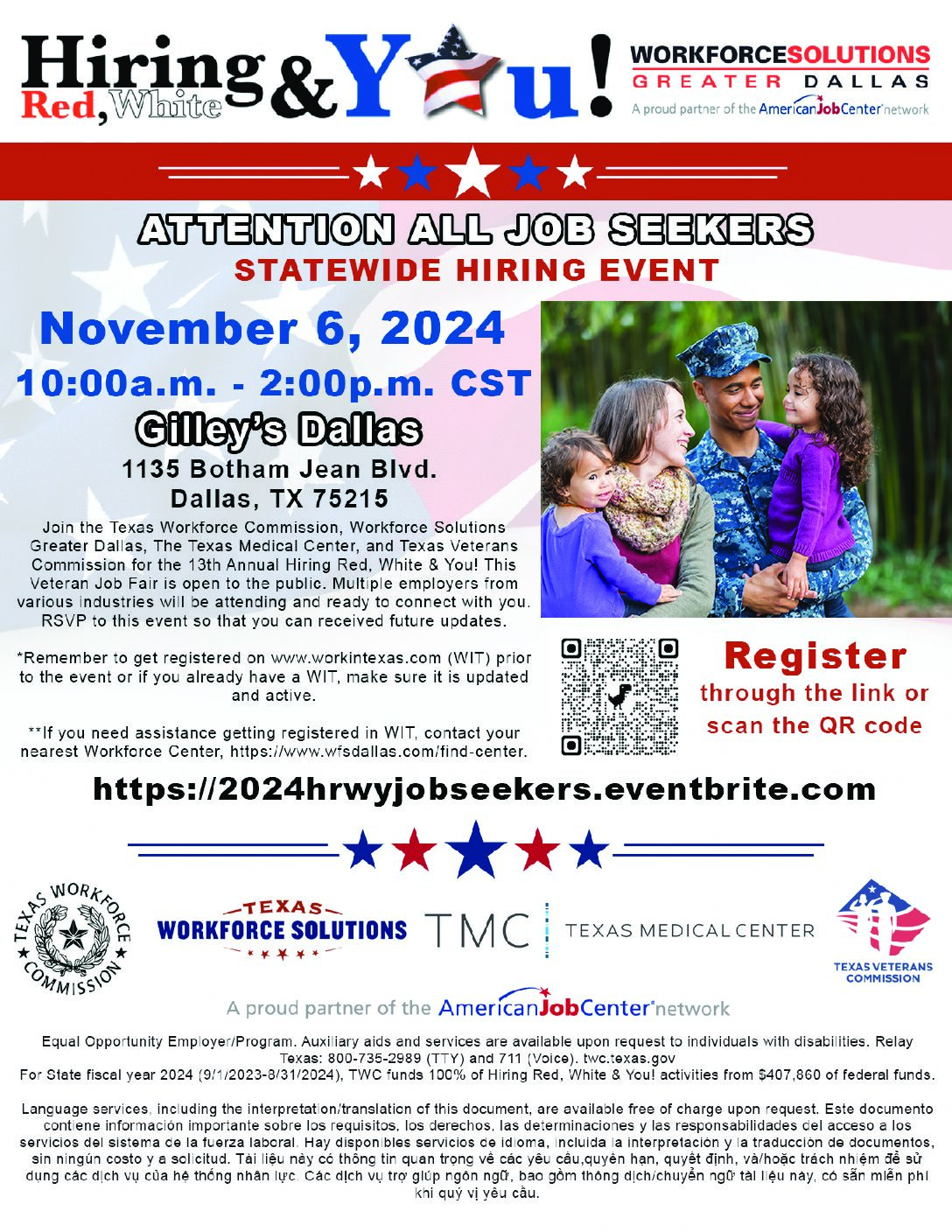 Join the Texas Workforce Commission, Workforce Solutions, the Texas Medical Center and the Texas Veterans Commission for the 13th Annual Hiring Red, White, & You! Statewide Hiring Fair to connect you with transitioning service members, military spouses, National Guard, Reserve, veterans and their family members.