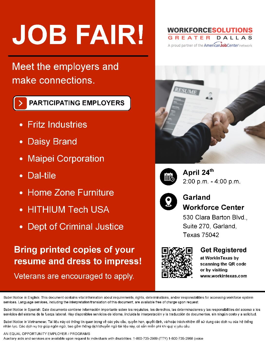 The Garland Workforce Center is hosting a job fair on April 24th from 2:00 p.m. to 4:00 p.m. with the following employers in attendance.