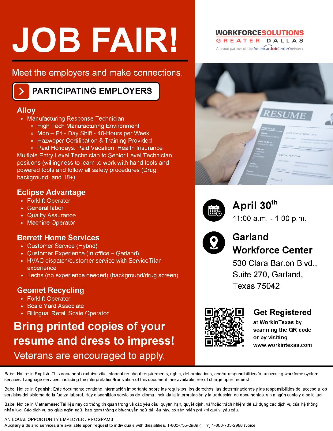 The Garland Workforce Center is hosting a job fair on April 30th from 11:00 a.m. to 1:00 p.m. with the following employers in attendance.