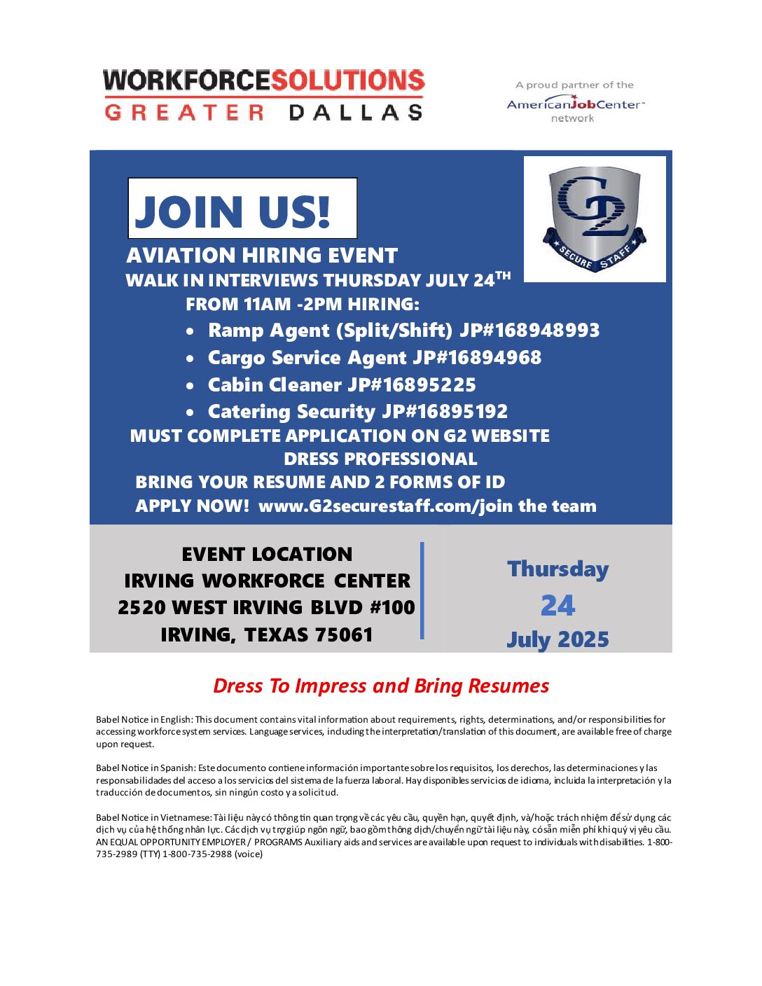 Visit the Irving Workforce Center for the opportunity to have walk in interviews with G2 Secure Staff. Make sure you complete the application on the G2 website, dress to impress, bring your resume and 2 forms of ID.