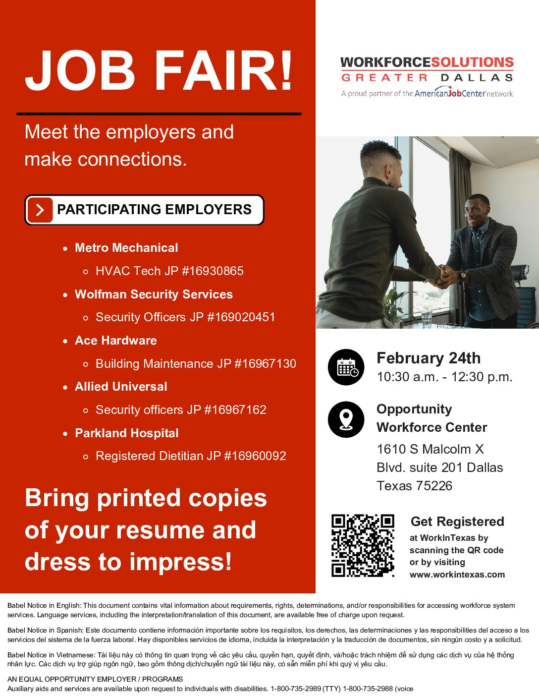 Our Opportunity Workforce Center is hosting a job fair Tuesday, February 24th, from 10:30 a.m. to 12:30 p.m. and the following employers .... |