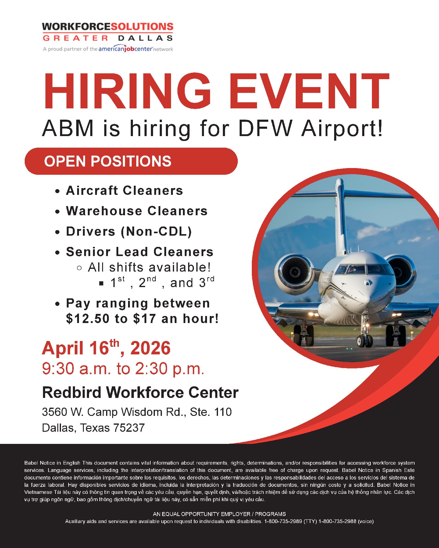 ![]() ![]() ABM is having a hiring event for the DFW Airport at The Redbird Workforce Center on April 16th from 9:30 a.m. to .... ![]() ![]() ![]() ![]() ![]() ![]() R.I.S.E.—Reinvent Yourself is a transformative Workforce Solutions Greater Dallas workshop designed to empower individuals seeking to redefine their career paths and embrace ....