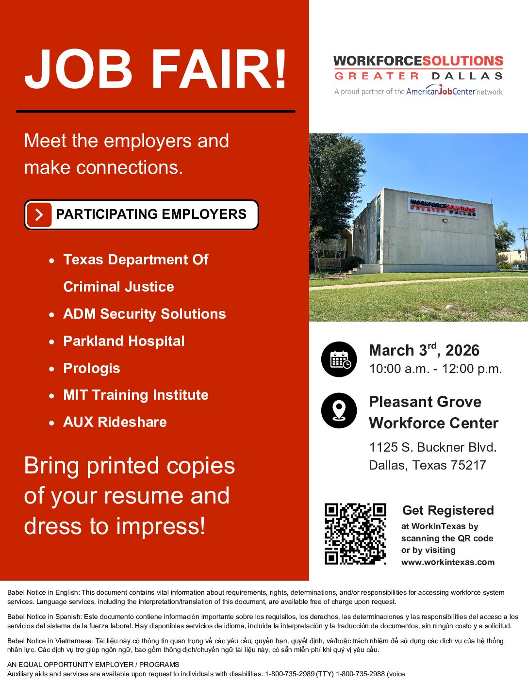 Visit the Pleasant Grove Workforce Center on Tuesday, March 3rd, from 10:00 a.m. to 12:00 p.m. to meet with recruiters from the .... |